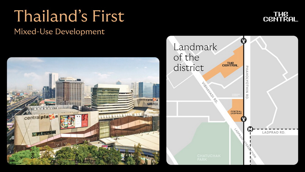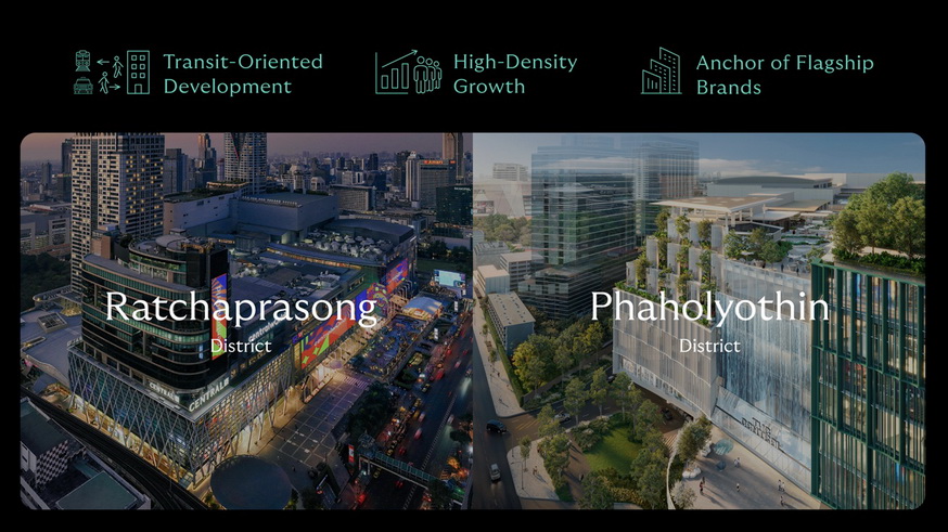 • พหลโยธินมีศักยภาพเทียบชั้นย่านราชประสงค์: ในฐานะย่านที่เป็นทำเลยุทธศาสตร์เหมาะกับการพัฒนาโครงการระดับ World-Class ได้แก่ 1) Transit-Oriented Development: เติบโตบนฐานโครงสร้างคมนาคมหลัก ทั้ง BTS, MRT และถนนสายสำคัญ เป็นจุดเชื่อมต่อการใช้ชีวิต–การทำงาน–การเดินทาง, 2) High-Density & Mixed Demand: รายล้อมด้วยดีมานด์คุณภาพสูง ทั้งที่อยู่อาศัยระดับกลาง–บน อาคารสำนักงาน โรงแรม และสถาบันการศึกษา และ 3) Anchor of Flagship Brands: เช่นเดียวกับที่ centralwOrld เป็น ‘Flagship Landmark’ ของราชประสงค์ ดังนั้น The Central พหลโยธิน จะเป็น ‘The Landmark of Northern Bangkok’ ที่ขับเคลื่อนการเติบโตของย่าน