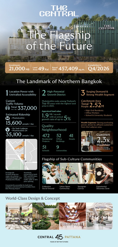 กรุงเทพฯ – บริษัท เซ็นทรัลพัฒนา จำกัด (มหาชน) ผู้นำเบอร์หนึ่งอสังหาริมทรัพย์ไทยเพื่อความยั่งยืน ตอกย้ำความสำเร็จโมเดลธุรกิจ ‘The Ecosystem for All’ แถลงวิสัยทัศน์การพัฒนาเมกะโปรเจ็กต์ The Central พหลโยธิน – The Flagship of the Future ศูนย์การค้าระดับแฟล็กชิพมูลค่าโครงการ 21,000 ล้านบาท ปักหมุดแลนด์มาร์กใหม่พร้อมยกระดับกรุงเทพฯ สู่มหานครระดับโลก สะท้อนศักยภาพย่านพหลโยธินที่เติบโตอย่างก้าวกระโดดเทียบชั้น CBD กรุงเทพฯ เตรียมเป็นย่านที่อยู่อาศัยและย่านเศรษฐกิจคุณภาพสูงทางตอนเหนือของเมือง ทั้งนี้โครงการตั้งอยู่บนที่ดิน 49 ไร่ พื้นที่ (GBA) 457,409 ตร.ม. พร้อมด้วย Convention Hall ขนาดใหญ่กว่า 6,700 ตร.ม. คาดก่อสร้างแล้วเสร็จใน Q4/2569