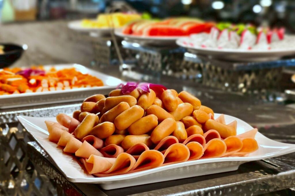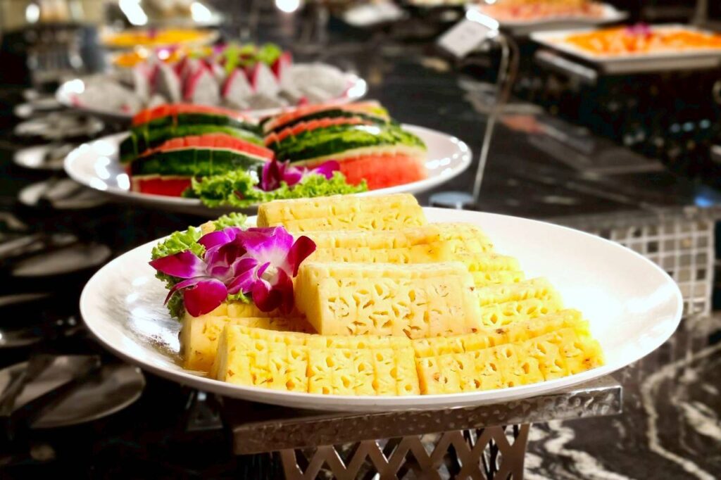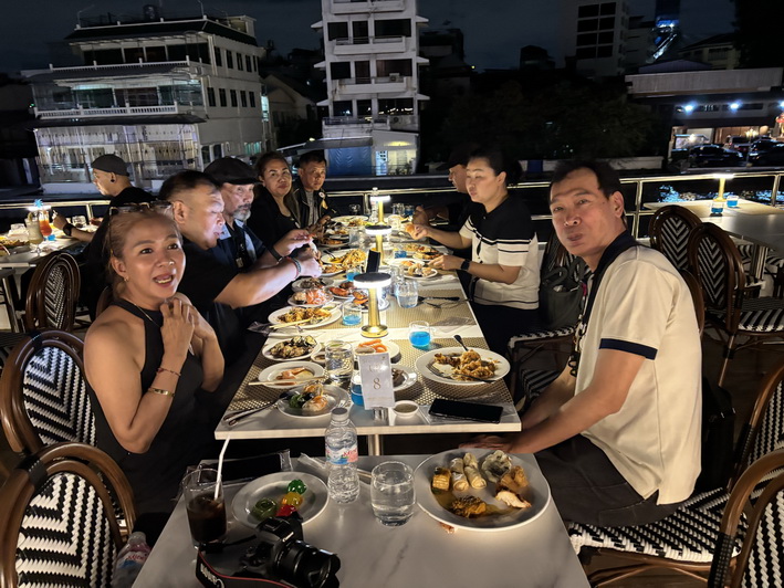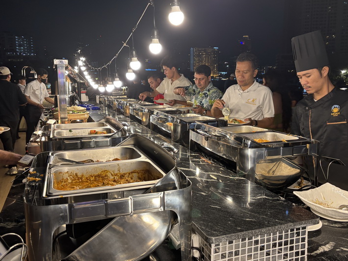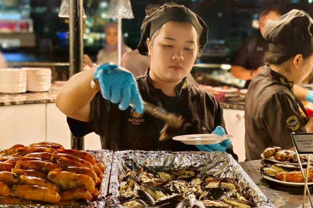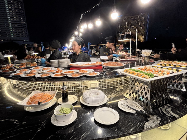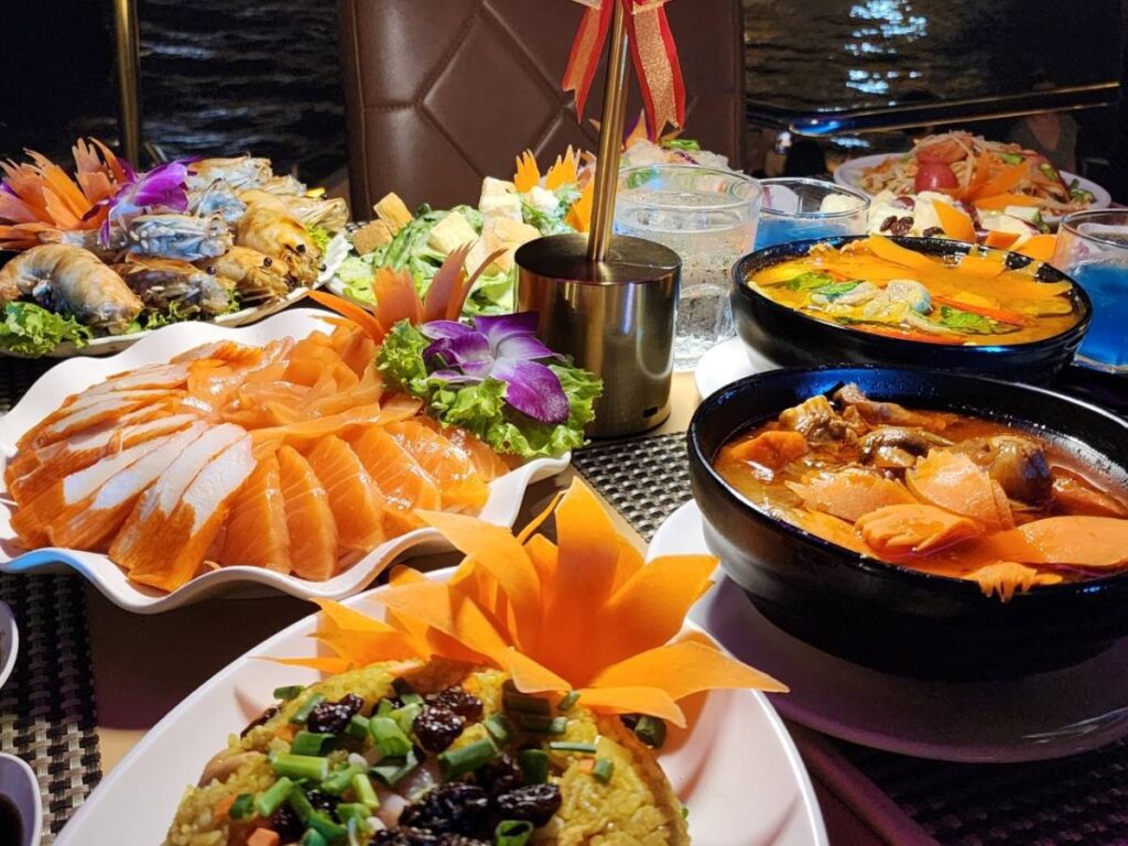 บนเรือมีอาหารบุฟเฟ่ต์นานาชาติกว่า 30 เมนูให้เลือกอิ่มไม่อั้น ทั้งอาหารไทยยอดนิยม ซูชิ ซาชิมิ อาหารทะเลสดใหม่ ขนมไทย ขนมเค้ก ผลไม้ตามฤดูกาล รวมถึงชาและกาแฟปิดท้ายอย่างอบอุ่น
