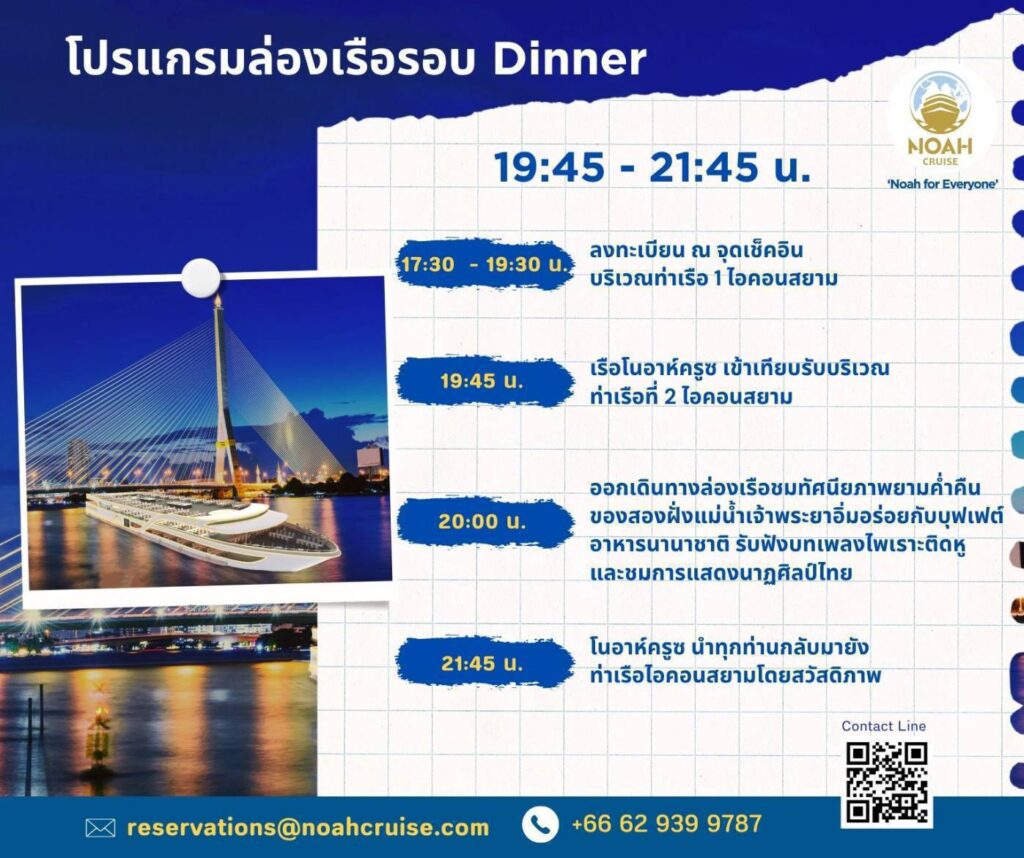 ติดต่อสำรองที่นั่ง โทร. 062-9399784 และทาง Line : @noahcruise หรือ Email : reservations@noahcruise.com ดูรายละเอียดได้ที่เว็บไซต์ www.noahcruise.com, Frecbook : Noah cruise