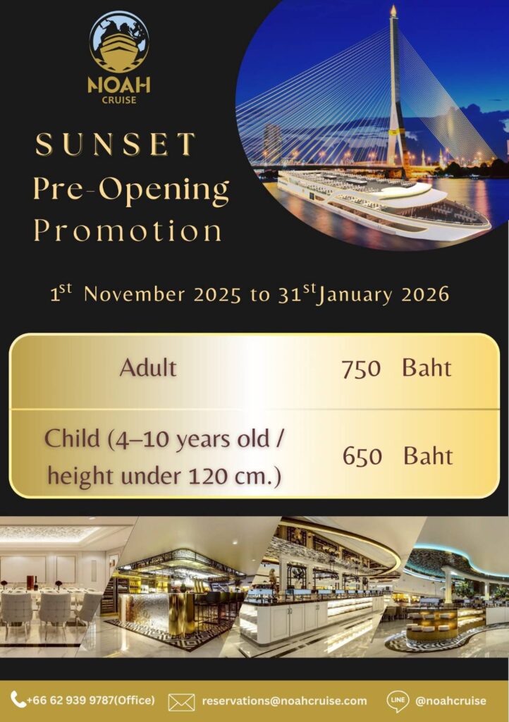 หากพูดถึงกิจกรรมที่ทั้งโรแมนติก สนุก และอิ่มอร่อยในเวลาเดียวกัน การล่องเรือดินเนอร์ชมวิวแม่น้ำเจ้าพระยา คงเป็นหนึ่งในลิสต์ที่หลายคนอยากสัมผัสสักครั้งในชีวิต — และตอนนี้ “โนอาห์ ครูซ (Noah Cruise)” ก็พร้อมพาทุกคนเปิดมิติใหม่ของการล่องเรือสุดหรูบนสายน้ำแห่งกรุงเทพฯ