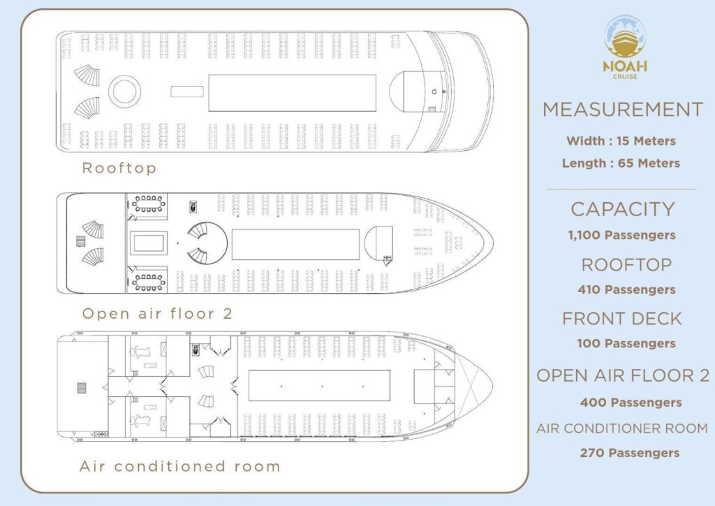โนอาห์ ครูซ เป็นเรือภัตตาคารขนาดใหญ่สุดอลังการ ความยาวกว่า 65 เมตร สูง 3 ชั้น โดดเด่นด้วยดีไซน์คลาสสิกผสานความทันสมัย และการออกแบบโดยคำนึงถึงความปลอดภัยและความสะดวกของผู้โดยสารทุกวัย ไม่ว่าจะเป็นห้องน้ำสำหรับผู้พิการ เบาะเปลี่ยนผ้าอ้อมเด็ก ลิฟต์สำหรับผู้สูงอายุ และมุมสูบบุหรี่แยกสัดส่วนชัดเจน
