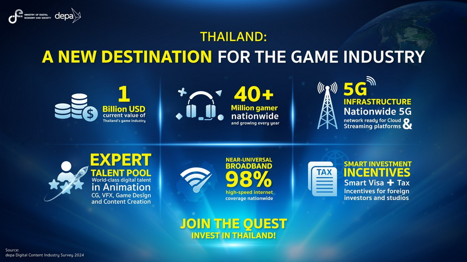 นอกจากนี้ จากผลสำรวจ Internet User พบว่า ประเทศไทยมีผู้เล่นเกมมากกว่า 40 ล้านคน และมีอัตราการเติบโตอย่างต่อเนื่อง สะท้อนถึงอำนาจซื้อและความต้องการ (Demand) ที่แข็งแรง ทำให้ไทยกลายเป็นตลาดที่น่าสนใจสำหรับการลงทุนในอุตสาหกรรมเกม ขณะเดียวกันประเทศไทยมีโครงสร้างพื้นฐานดิจิทัลที่พร้อมรองรับอุตสาหกรรมเกมอย่างเต็มรูปแบบ โดยมีอินเทอร์เน็ตความเร็วสูงครอบคลุมกว่า 98% ของพื้นที่ทั่วประเทศ และเครือข่าย 5G ที่มีความเร็วและเสถียรภาพสูงในหลายพื้นที่ ทำให้สามารถรองรับทั้งการผลิตคอนเทนต์และการให้บริการด้าน Cloud และ Streaming ได้อย่างมีประสิทธิภาพ ตลอดจนรัฐบาลไทยได้จัดเตรียมมาตรการจูงใจสำหรับนักลงทุนต่างชาติ อาทิ Smart Visa สำหรับผู้เชี่ยวชาญและนักลงทุนในอุตสาหกรรมเทคโนโลยี มาตรการยกเว้นภาษีและสิทธิประโยชน์ทางภาษี (Tax Exemption/Tax Incentive) สำหรับการตั้งสตูดิโอหรือลงทุนในไทย รวมถึงระบบ Ease of Doing Business ที่ช่วยให้ผู้ประกอบการสามารถเริ่มต้นธุรกิจในไทยได้อย่างรวดเร็วและสะดวก ทั้งหมดนี้สะท้อนให้เห็นว่าไทยมีทั้งความพร้อมด้านบุคลากร ตลาดผู้บริโภค และโครงสร้างพื้นฐาน ที่เอื้อต่อการเติบโตของอุตสาหกรรมเกมอย่างครบวงจร ทั้งยังสร้างความมั่นใจให้กับนักลงทุนทั้งในและต่างประเทศ
