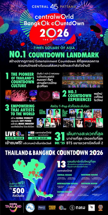 “Love Unites Us All” กับการจุดพลุ Synchronize นับแสนลูก รวมศิลปินไทยตัวท็อป กว่า 500 ชีวิต ครอบคลุมทุกแนวเพลง อาทิ โบกี้ไลออน, URBOYTJ, Tattoo Colour, Three Man Down, 4EVE, ไทยทศมิตร, PARADOX, Silly Fools และ ZEAL เป็นต้น แสงสีเสียงกระหึ่มทั่วไทย เซ็นทรัล เชียงใหม่ เคานต์ดาวน์ใหญ่ที่สุดภาคเหนือ และ เซ็นทรัล ขอนแก่น และโคราช แลนด์มาร์กภาคอีสาน เป็นต้น เตรียมพบกับปรากฎการณ์ Countdown Entertainment ยิ่งใหญ่ระดับโลก ส่งท้ายปี ‘centralwOrld Bangkok Countdown 2026 The Original – A Tribute To Love’ และมันส์ทั่วประเทศในงาน “Thailand Countdown 2026 – Love Unites Us All” คลิก : https://bit.ly/4ponQVA