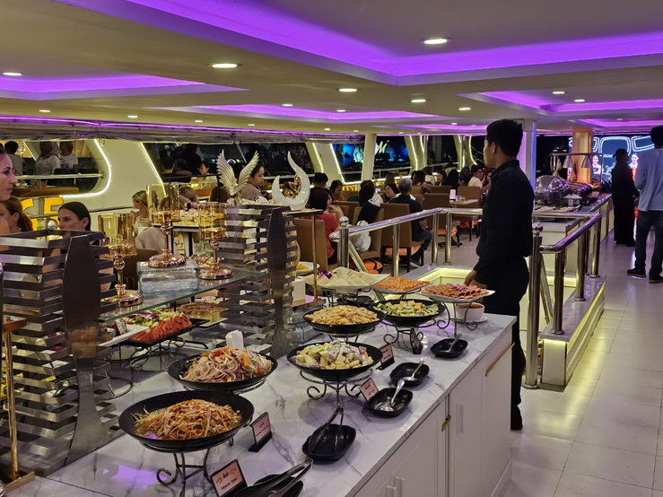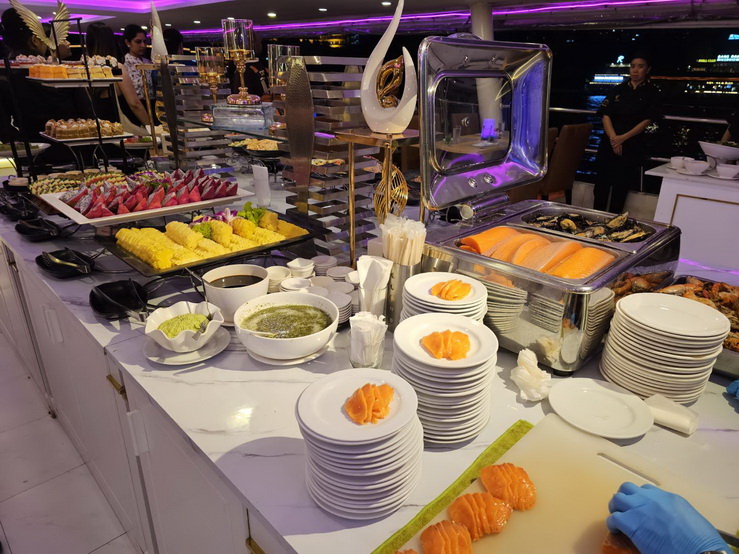 ลูกค้าจะได้อิ่มอร่อยกับ บุฟเฟ่ต์นานาชาติแบบไม่อั้น คัดสรรเมนูคุณภาพหลากหลายสไตล์ ไฮไลต์อยู่ที่ซีฟู้ดสดใหม่ ทั้ง กุ้งแม่น้ำเผาตัวโต หอยแมลงภู่ชิลีอบเนยกระเทียม แซลม่อนซาชิมิ รวมถึงเมนูอาหารไทยและนานาชาติอีกมากมาย ปรุงสด เสิร์ฟร้อน ตลอดช่วงเวลาการล่องเรือ