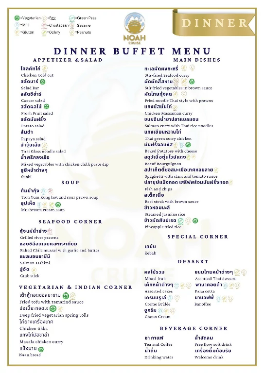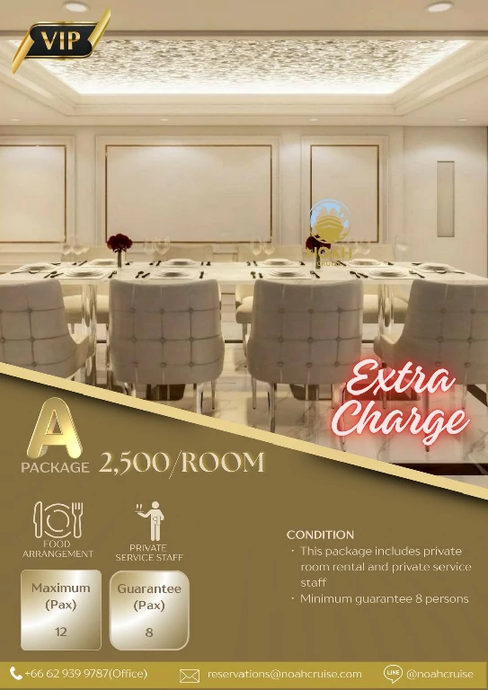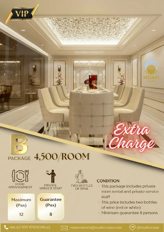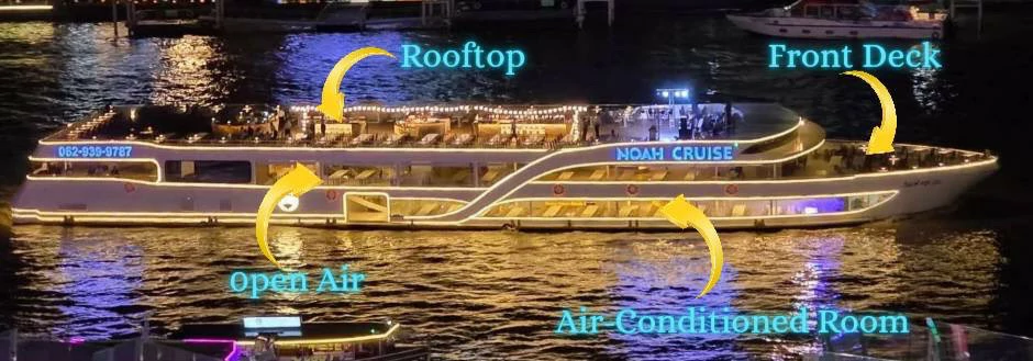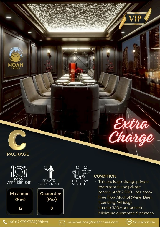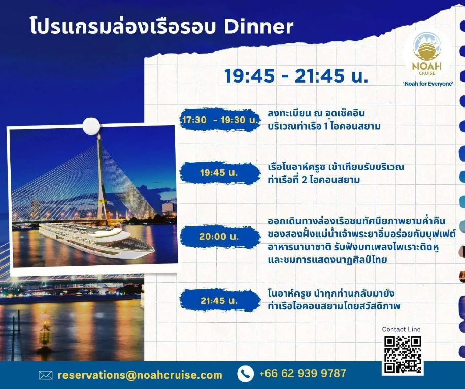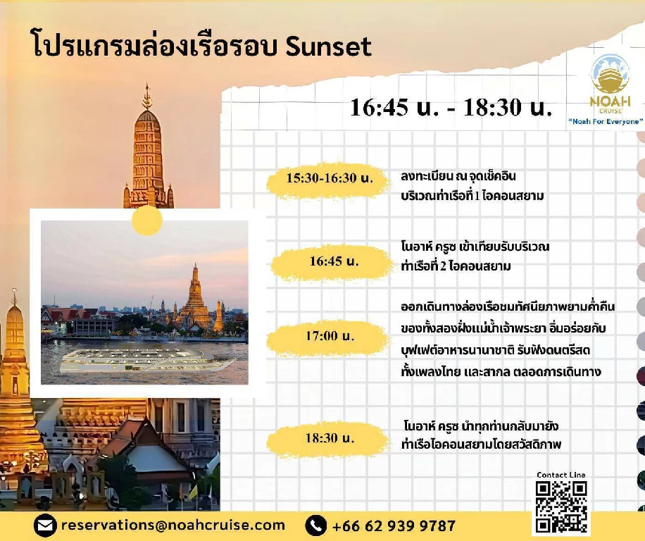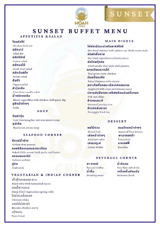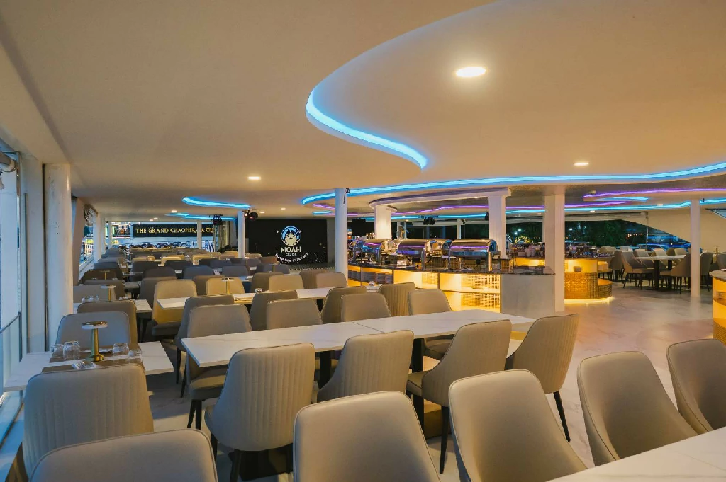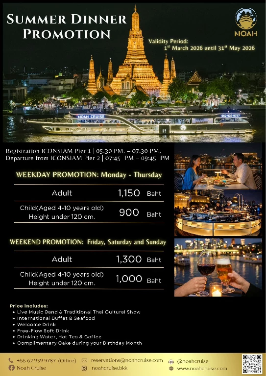 โนอาห์ ครูซ เปิดมิติใหม่ของการล่องเรือดินเนอร์บุฟเฟ่ต์แม่น้ำเจ้าพระยา พร้อมบริการทุกท่านที่ท่าไอคอนสยาม รอบซันเซ็ท และ รอบดินเนอร์ ตลอดการเดินทาง ท่านจะได้สัมผัสกับความงดงามของทัศนียภาพทางสายน้ำ เพลิดเพลินไปกับการรับประทานอาหาร และสนุกสนานไปกับเสียงเพลงไพเราะ