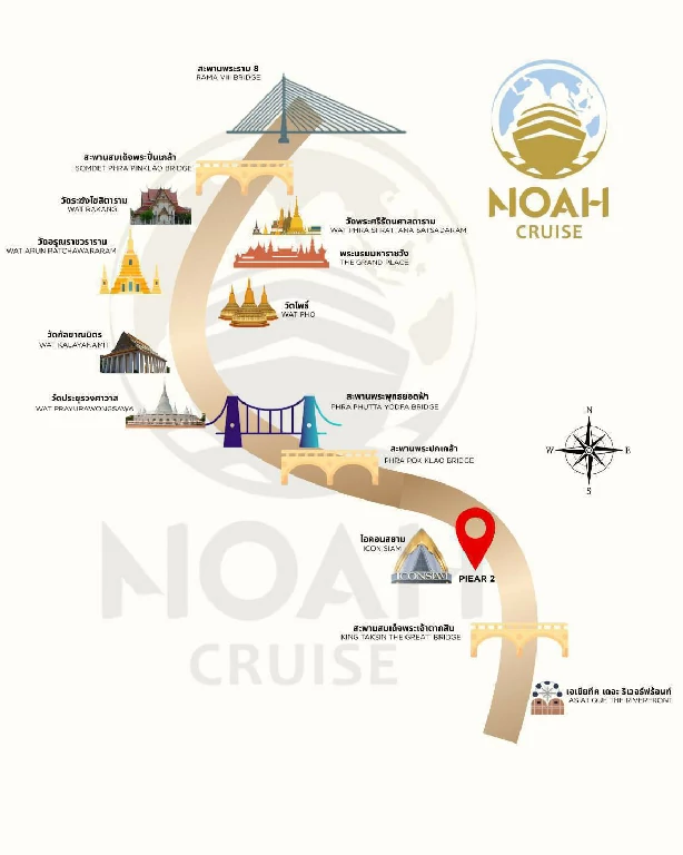 เรือโนอาห์ ครูซพาทุกท่านล่องชมทัศนียภาพแสงสีเสียงยามค่ำคืนสองริมฝั่งแม่น้ำเจ้าพระยาเริ่มต้นที่ ไอคอนสยาม สะพานพุทธญอดฟ้า ยอดพิมานริเวอร์วอล์ค วัดกัลยาณมิตร วัดอรุณราชวราราม ป้อมวิไชยประสิทธิ์ วัดระฆังโฆสิตาราม วัดพระแก้ว พระบรมมหาราชวัง สะพานพระราม 8 เอเชียทีค เดอะริเวอร์ฟร้อนท์ (อาจมีการเปลี่ยนแปลงเส้นทางการล่องเรือโดยไม่ได้แจ้งให้ทราบล่วงหน้า เนื่องจากระดับน้ำขึ้นน้ำลงที่อาจมีความไม่แน่นอน)
