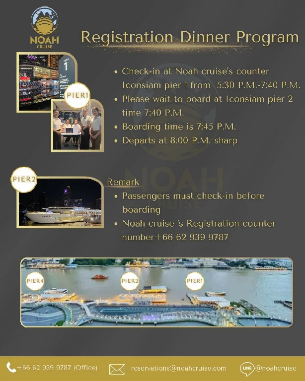 17.30 น. – 19.30 น.ลงทะเบียน ณ จุดบริการลูกค้า โนอาห์ ครูซ บริเวณท่าเรือที่ 1 ไอคอนสยาม