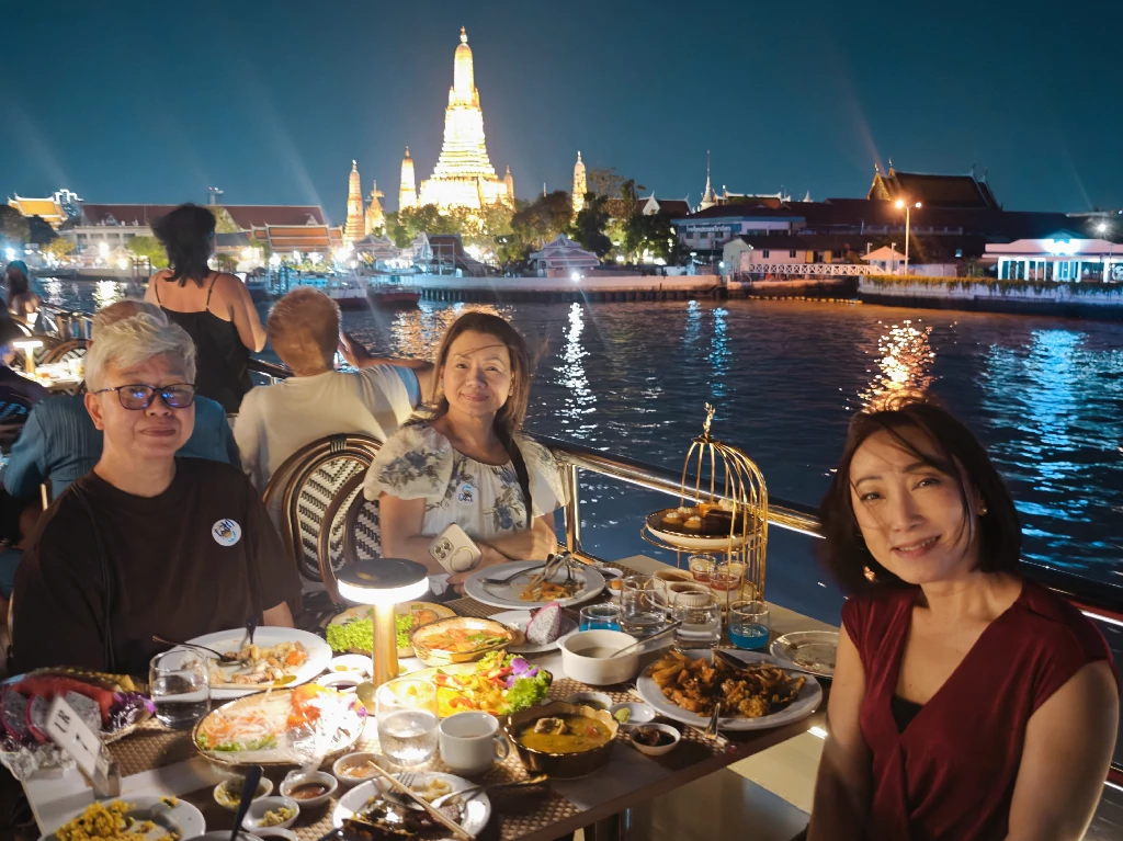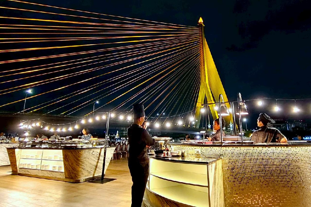 นอกจากจะได้ชื่นชมความงามของทิวทัศน์ริมแม่น้ำเจ้าพระยา อันเปรียบเสมือนเส้นเลือดหล่อเลี้ยงวิถีชีวิตของชาวไทยมาแต่โบราณกาลแล้ว ท่านจะได้อิ่มอร่อยกับบุฟเฟ่ต์อาหารไทยและอาหารนานาชาติกว่า 30 รายการ ล้วนแล้วแต่เป็นเมนูยอดนิยม ไม่ว่าจะเป็น ซูชิ ซาชิมิ อาหารทะเล อาหารมังสวิรัติ ขนมไทย ขนมเค้ก ผลไม้ประจำฤดูกาล รวมถึงชาและกาแฟ