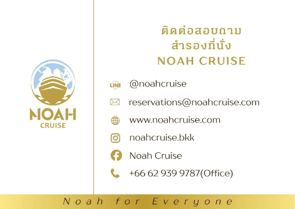 วันนี้ทีมงานของโนอาห์ ครูซพร้อมให้บริการสุดประทับใจแก่ทุกท่านแล้ว มาร่วมเปิดประสบการณ์ความบันเทิงครบรส และอิ่มเอมไปกับการเดินทางบนเรือลำใหญ่ที่จะกลายเป็นตำนานไปด้วยกัน