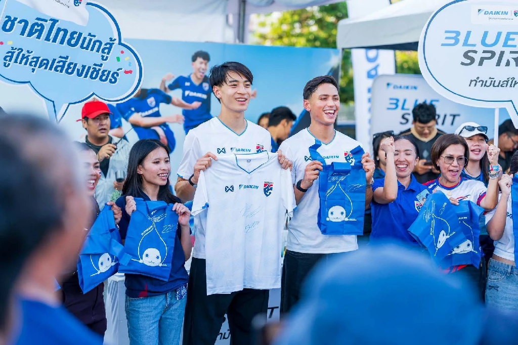 คุณสึโทมุ คูริฮาระ ประธานบริษัทไดกิ้น อินดัสทรีส์ (ประเทศไทย) จำกัด, คุณฮุนจัง คิม ผู้ช่วยผู้จัดการทั่วไป กลุ่มบริหารแบรนด์องค์กร บริษัทไดกิ้น อินดัสทรีส์ (ประเทศไทย) จำกัด, คุณ เอกพล พลนาวี เลขาธิการสมาคมกีฬาฟุตบอลแห่งประเทศไทยฯ, และนักกีฬาตัวแทนทีมชาติไทยอย่าง พาตริก กุสตาฟส์สัน และ นาธาน เจมส์ ร่วมมอบเสื้อรีไซเคิล “We Cheer We Care” ให้แก่ตัวแทนเยาวชน เพื่อสนับสนุนโอกาสในการพัฒนาทักษะและศักยภาพด้านกีฬาของเยาวชนไทย